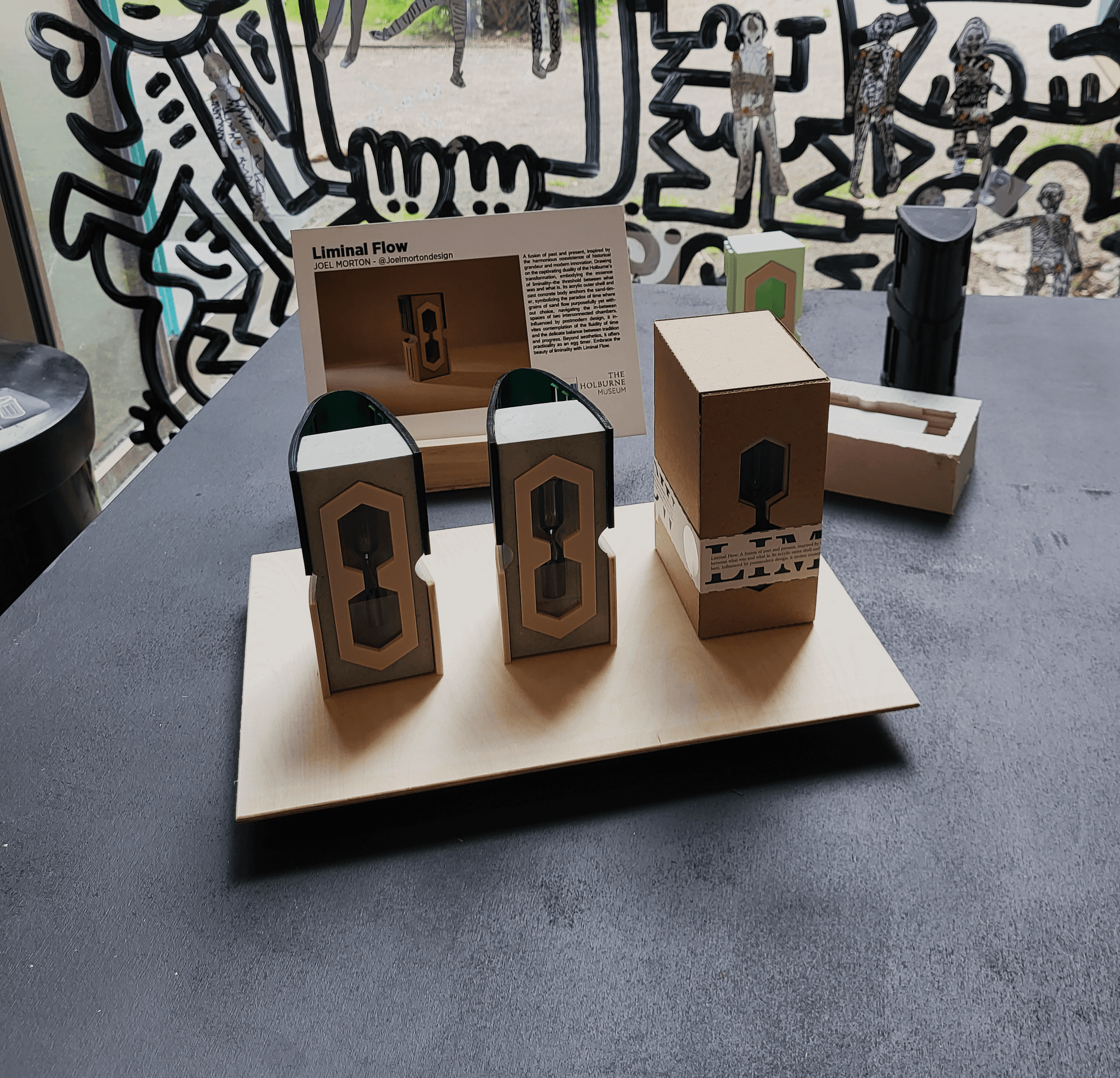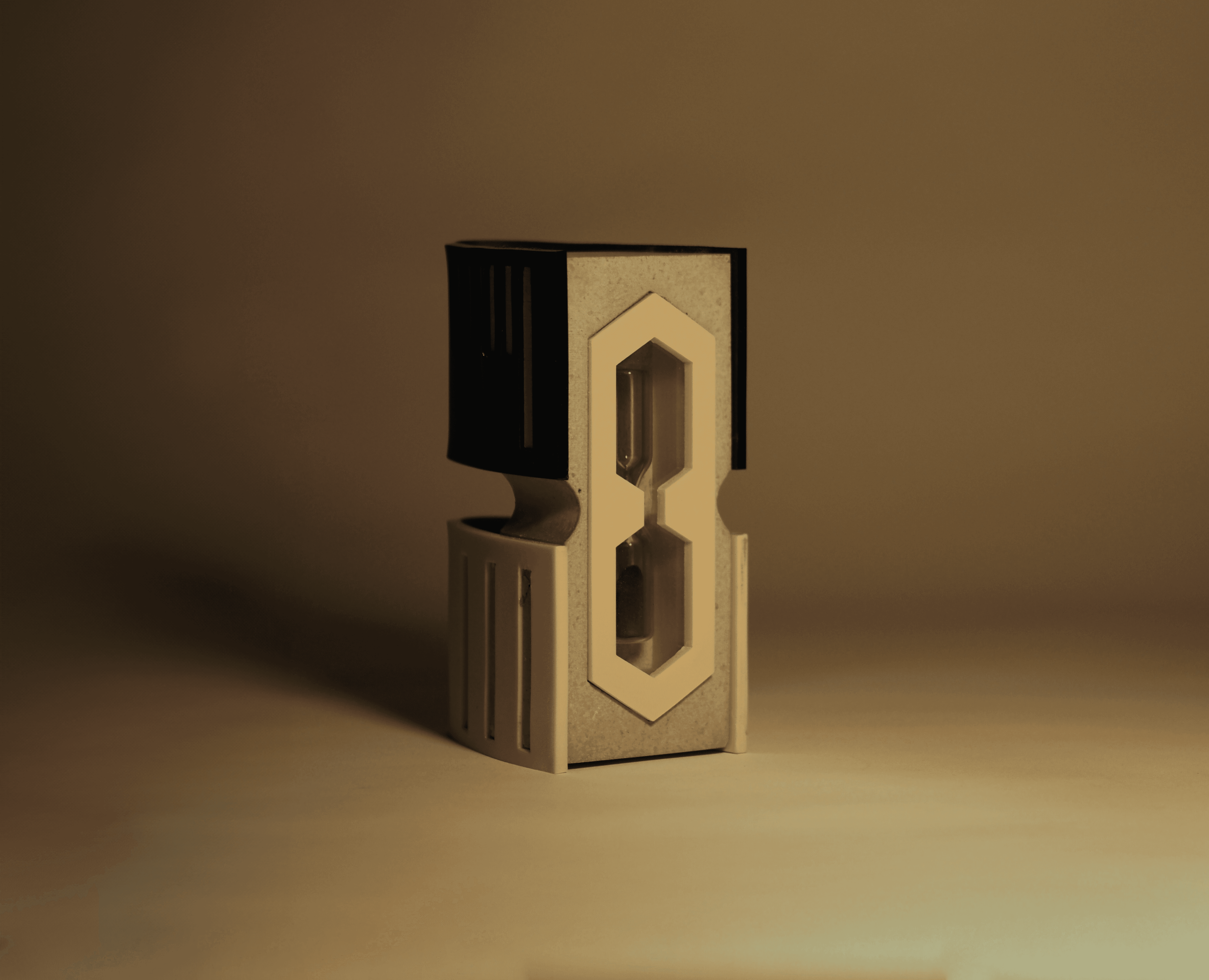 Drawing from the vertical fins of the museum’s modern extension and the muted tones of its classical façade, the object balances acrylic and cast concrete to frame the passage of sand as a metaphor for time, transition, and continuity. Beyond its symbolic role, the piece functions practically as an egg timer.